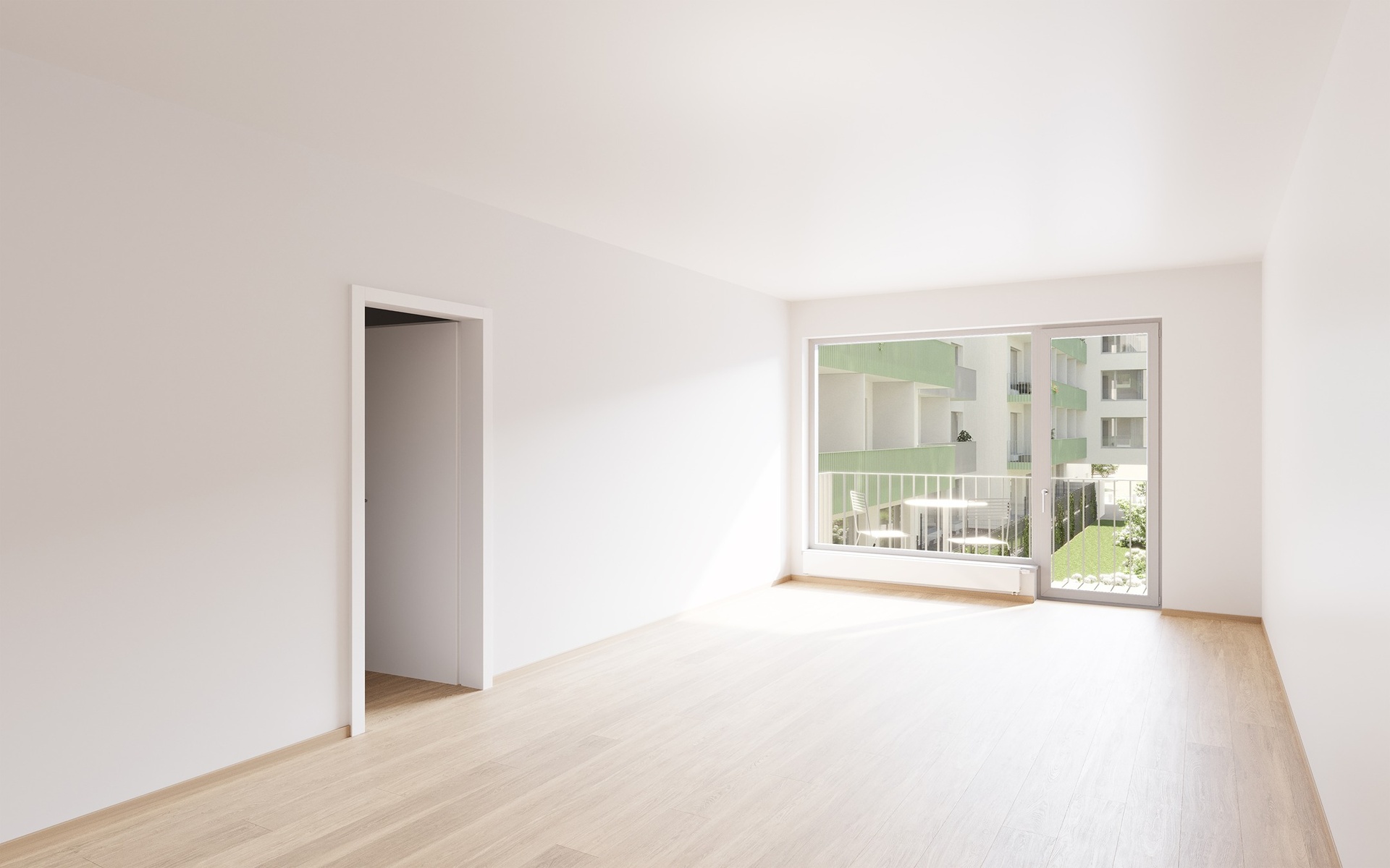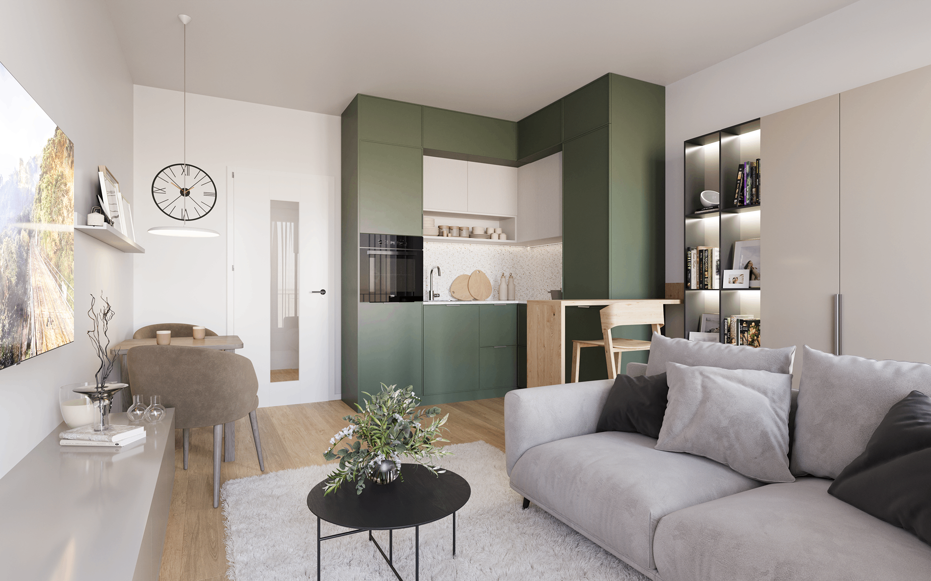 Průchozí vnitroblok nabízí upravenou zeleň, vzrostlé stromy, květinové záhony a kvalitní mobiliář. Barevné pojetí v bílé a olivově zelené harmonicky odráží propojení s okolní přírodou.