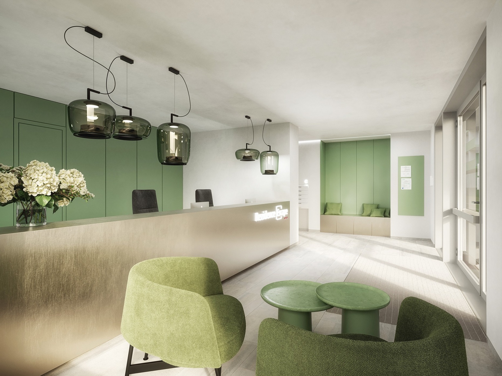 Elegantní vstupní hala s prostornou recepcí a poštovními schránkami nabídne příjemné uvítání hned při vstupu do domu. Recepce bude k dispozici 24/7 a zajistí nejen služby pro rezidenty, ale také bezpečný úložný prostor pro zásilkové služby.